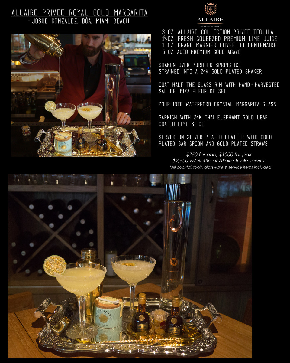 Allaire Royal Gold Margarita is available at DÔA in South Beach for $750 for one, $1000 for pair and $2500 as table side service leaving plenty of margarita to share!