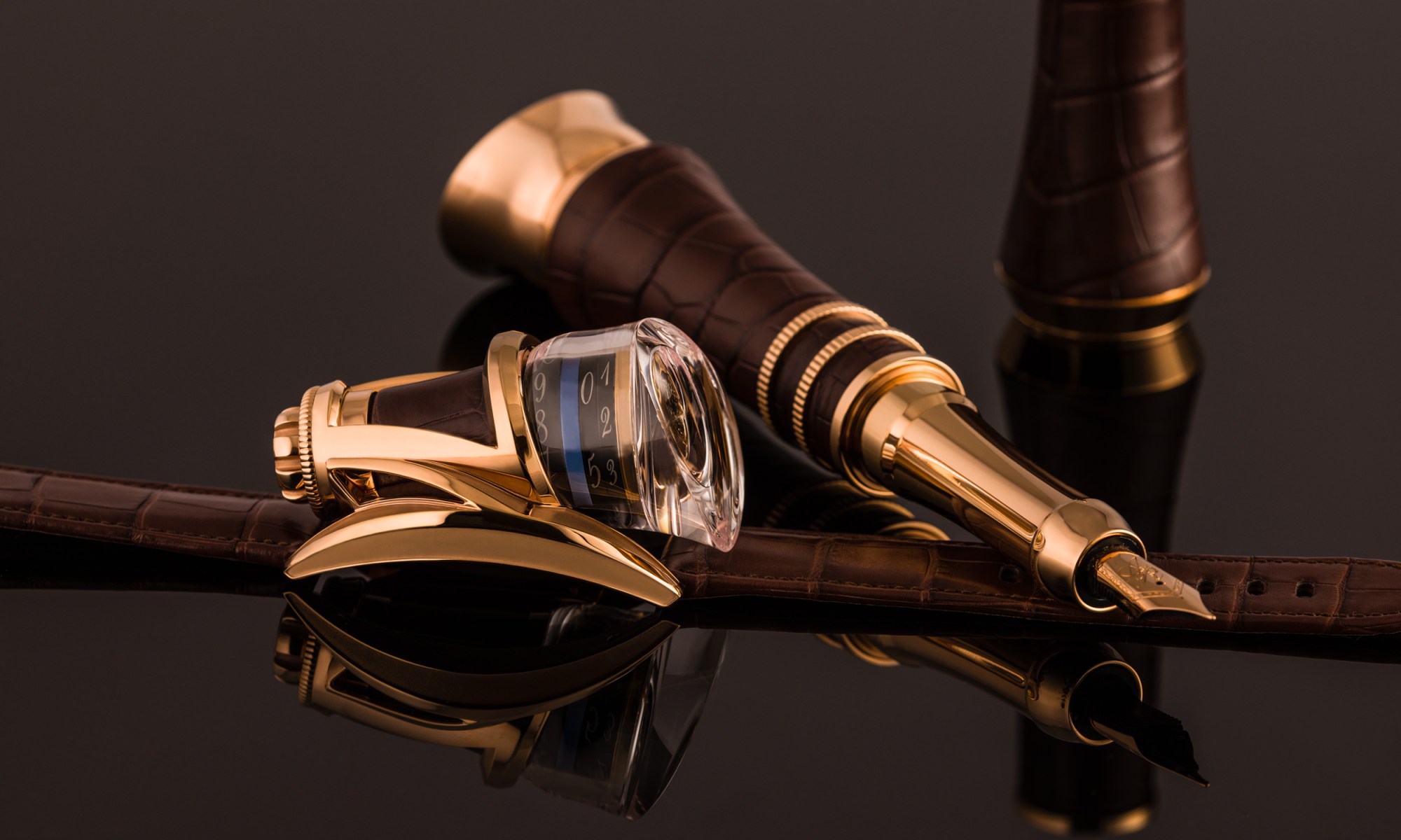 Fixed to a pen, it brings together the arts of fine writing and watchmaking within a truly unique object. The intricately designed pen is made of 18k gold encased in alligator leather. The gold nib is available in different sizes to suit the specifications of the client and enhance writing comfort. It comes with either a piston filler or a cartridge. A proprietary clip and orientation system ensure all parts are perfectly aligned enhancing its elegant ergonomic curves.