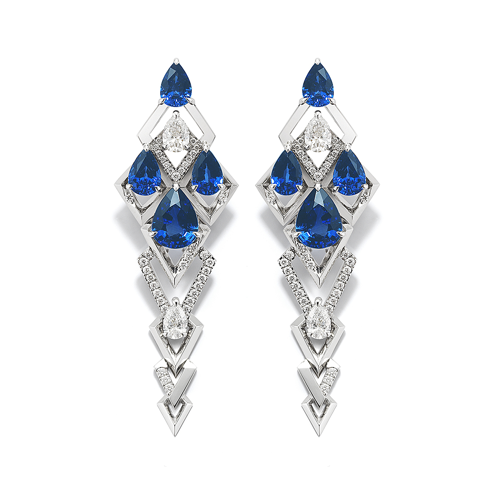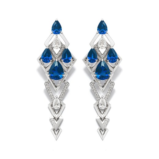 8×6 & 6×4 pear-shaped sapphires designed in a sculptural form surrounded by 1.03 carat VS diamonds and 18K white gold. These beautifully crafted earrings are an adornment of art- sure to turn heads