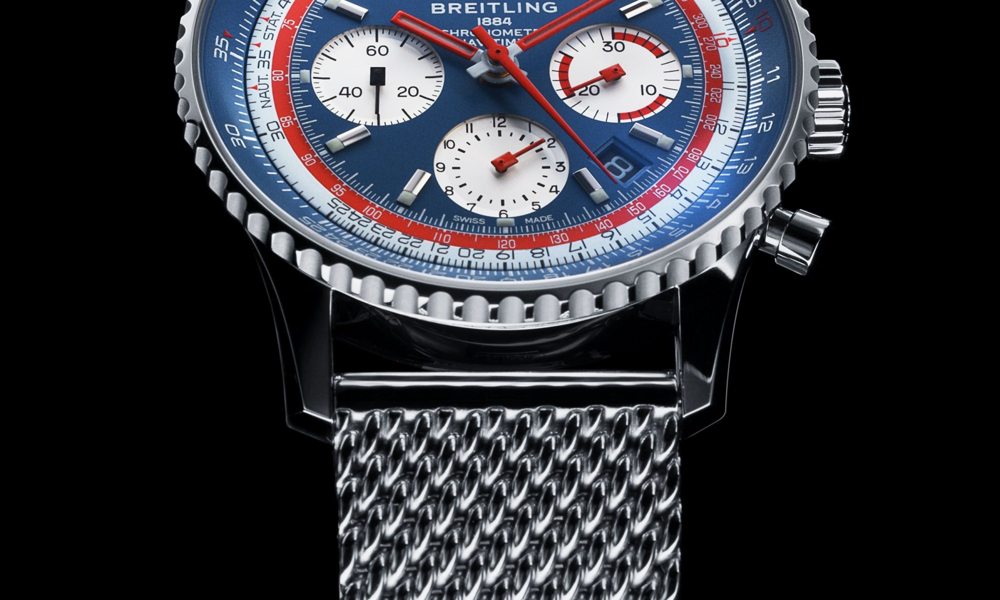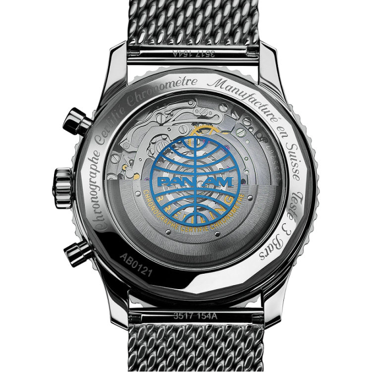 The officially licensed Navitimer 1 B01 Chronograph 43 Pan Am Edition is distinguished by one of the most recognizable logos in the history of aviation printed on its transparent sapphire caseback. For decades, Pan American World Airways was a dominant force in commercial aviation and, long after the airline ceased operations, it is still closely linked with the excitement of air travel. The Pan Am Edition has a stainless-steel case with a blue dial, silver subdials, and a vintage-inspired brown leather strap, a Breitling Air Racer bracelet, or a stainless-steel mesh bracelet. The Pan Am Edition is the second member of Breitling’s capsule collection, joining Swissair. Keep an eye out for another legendary airline that will be taking off shortly!