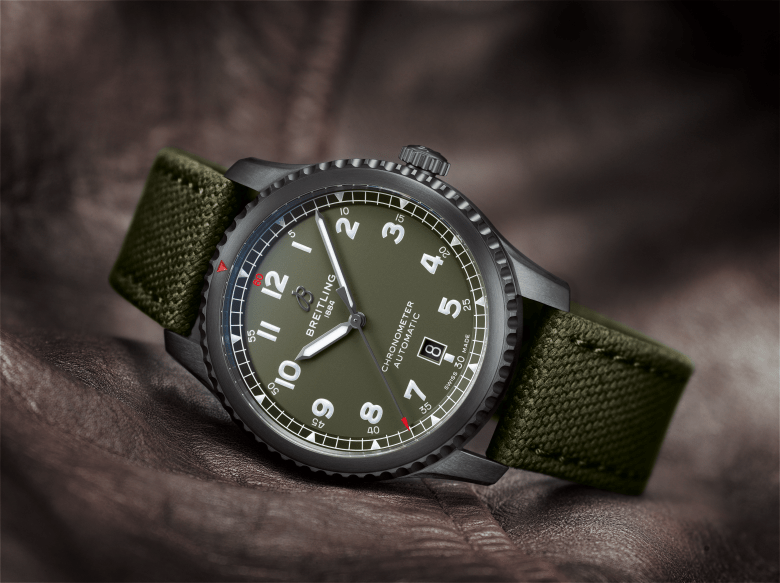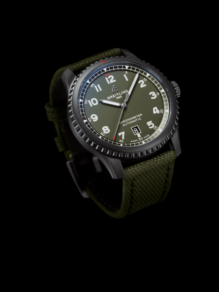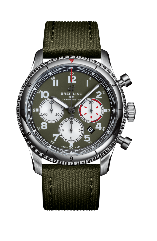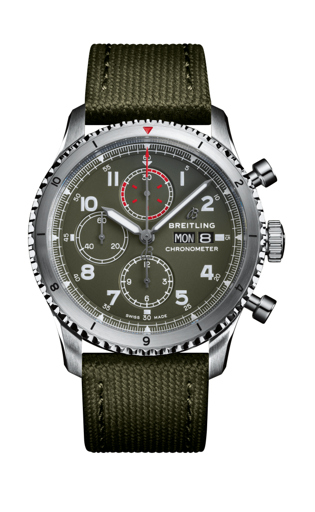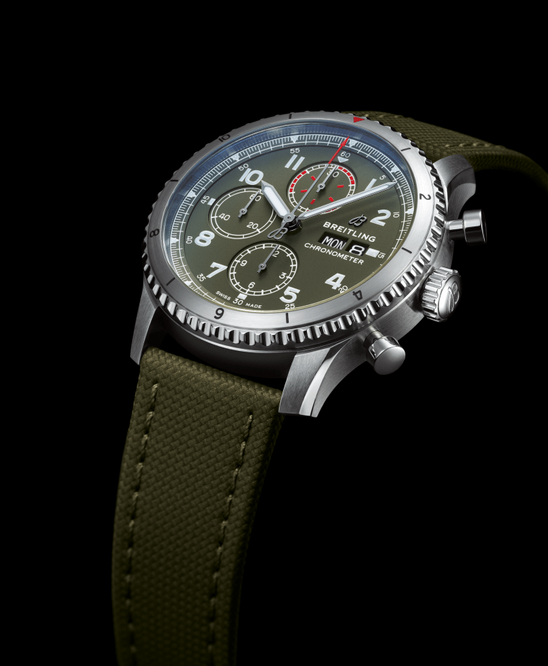The Breitling Aviator 8 Chronograph 43 Curtiss Warhawk The Aviator 8 Chronograph 43 Curtiss Warhawk features a military green dial with a matte finish and tone-on-tone subdials – 12-hour and 30-minute chronograph counters and a small second subdial. Its black nickel-plated hour and minute hands, as well as the Arabic numerals on the dial, are coated with Super-LumiNova®, so they are legible even in the most challenging of lighting conditions. At the heart of the Aviator 8 Chronograph 43 Curtiss Warhawk is the Breitling Caliber 13, a mechanical movement renowned for its stability and performance. It offers a power reserve of approximately 42 hours. The chronograph’s distinctive caseback is engraved with a Curtiss inscription and an image of a P-40 Warhawk with the dramatic shark’s mouth paintwork that made a powerful visual impact when the plane was part of the Chinese Air Force’s famous Flying Tigers unit and flown by pilots of the American Volunteer Group. This COSC-certified chronometer, which is water-resistant up to 10 bar (100 meters/330 feet), is presented on a green military strap. The Breitling Aviator 8 Automatic 41 Curtiss Warhawk