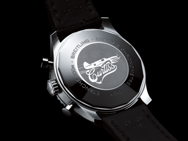 The Breitling Aviator 8 B01 Chronograph 43 Curtiss Warhawk The Aviator 8 B01 Chronograph 43 Curtiss Warhawk is distinguished by its military green dial with a matte finish. The contrasting silver subdials – 12-hour and 30-minute chronograph counters and a small second subdial – indicate that the watch is driven by the Breitling Manufacture Caliber 01, the brand’s in-house mechanical movement, which delivers a remarkable power reserve of approximately 70 hours. The striking chronograph is equipped with a bidirectional rotating bezel featuring Arabic numerals and indexes as well as a practical red pointer. The Super-LumiNova® coating on the hour and minute hands and the Arabic numerals on the dial make it easy to read the time in any light. The COSC-certified chronometer has a 43-millimeter stainless-steel case presented on a green military strap. It is water-resistant up to 10 bar (100 meters/330 feet). The eye-catching caseback has a transparent sapphire crystal printed with a Curtiss inscription and an image of an airborne P-40 Warhawk, whose design, with its shark’s mouth and color scheme, is based on the characteristic paint job associated