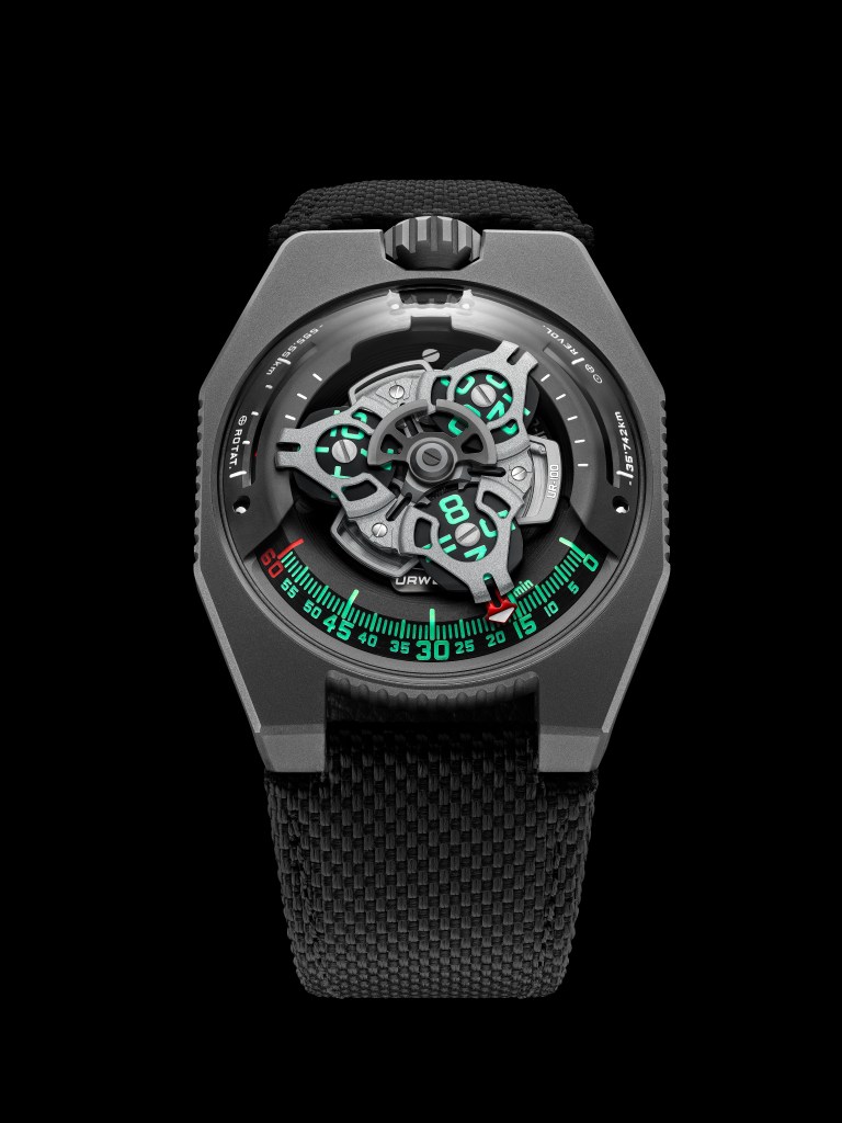 Under the UR-100’s dome, URWERK’s calibre 12.01 movement drives the carousel carrying the hours on three satellites that travel in succession along a 60-minute scale. Each is forged from anodised aluminium then sanded and shot-blasted. The satellite screws are each circular sanded. The satellites rest on a carousel of sanded brass plated in ruthenium. The structure on top of the hours display is in sanded and shot-blasted aluminium. The bi-directional selfwinding rotor of the UR-100 is governed by a profiled airscrew known as the Windfänger.