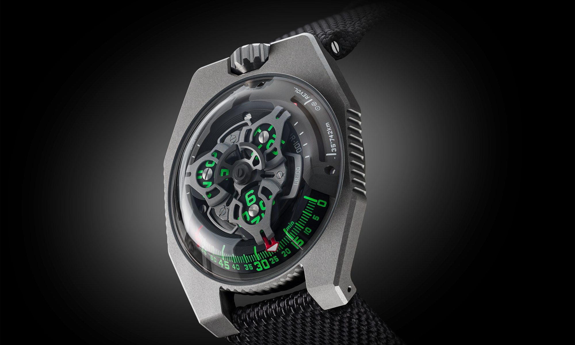 In addition to URWERK’s trademark satellite configuration of the wandering hours and minutes, the UR-100 GunMetal brings your spin through space into sharp focus. When the minutes hand has completed its 60-minute journey, it reappears on a 20-minute scale of 555 kilometres. This is the distance you travel in 20 minutes if you are standing on the equator of our rotating planet. The opposite scale tracks your journey through space around the sun: 35,740km every 20 minutes.