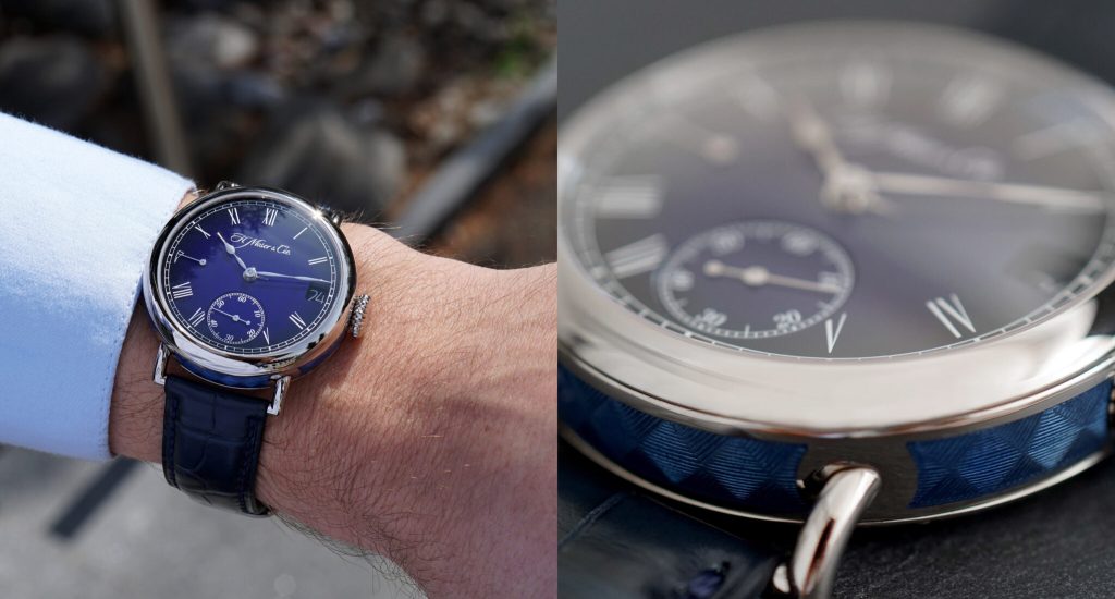 | Showcasing the skills of master craftsmen, H. Moser & Cie. has chosen the classic rounded accents of the Heritage case to pay tribute to its perpetual calendar. Its Grand Feu enamel dial in brand new shades reinterprets the aesthetic of the brand’s famous fumé dials, with their subtle colour gradations. This technical feat is further enhanced by the engraving and the enamel inserts adorning the sides of the Heritage Perpetual Calendar Midnight Blue Enamel, which forges a link between past and present, between traditional and contemporary. Reminiscent of the pocket watches converted to wristwatches in the early 1920s using fine attachments, this creation is largely inspired by vintage timepieces conceived by Heinrich Moser, founder of H. Moser & Cie. At the same time, it displays a resolutely contemporary character thanks to the use of striking midnight-blue fumé and a high-end manufacture movement. |