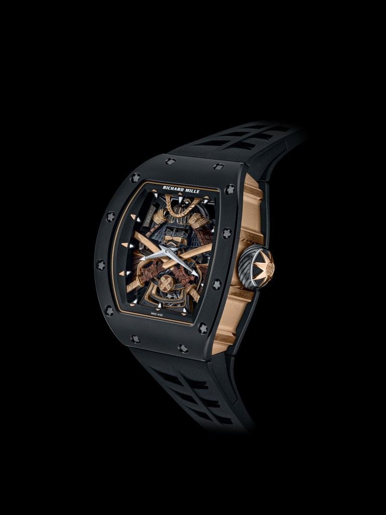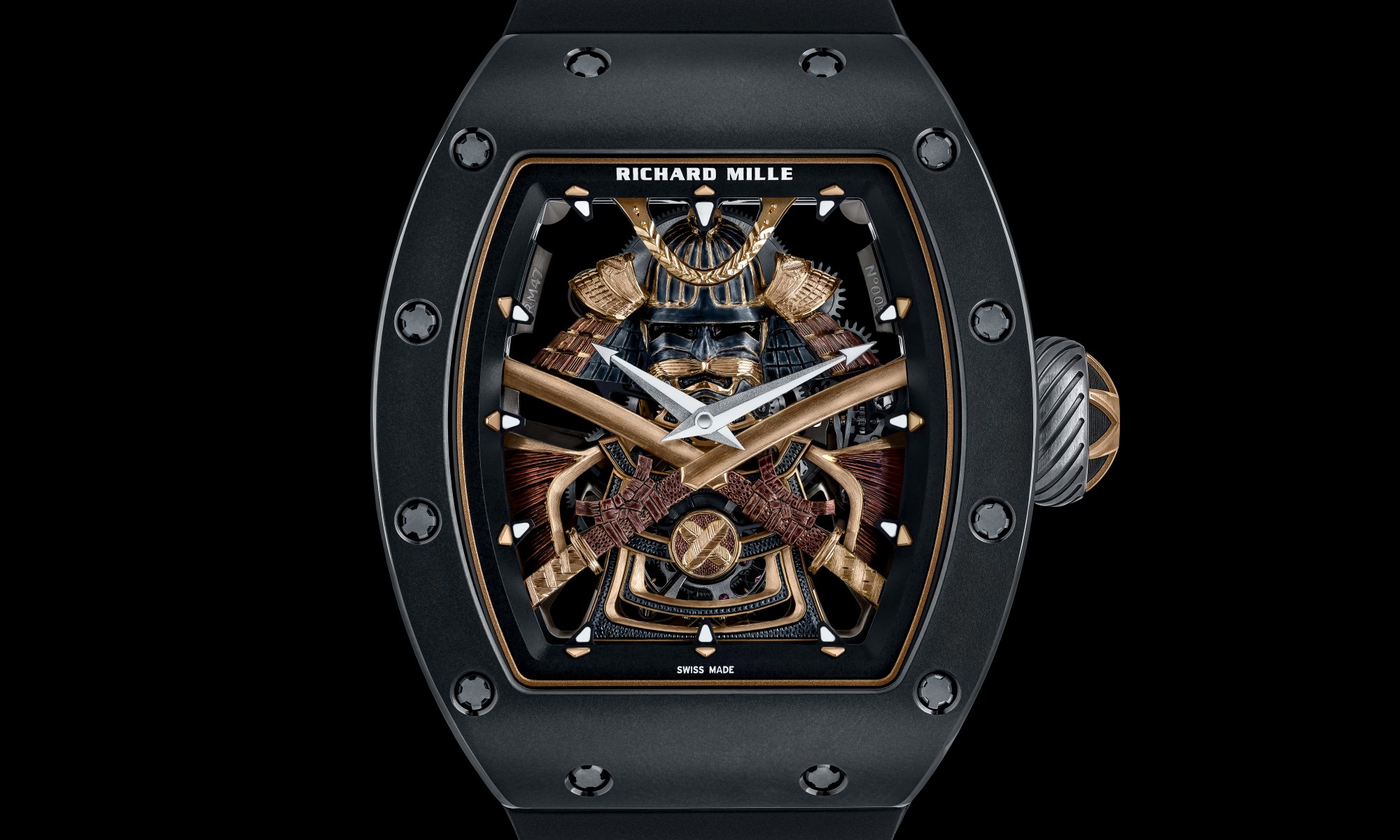 Associating art and spirituality. Creating a new masterpiece designed as an aesthetic tribute to Japanese culture. Richard Mille presents the RM 47 Tourbillon, the fruit of intense reflection and nearly four years of design work. This is an artful watch of a new kind, incorporating an extremely compact calibre, specifically designed to make room for a stylised Samurai suit of armour entirely crafted by hand. The model was born of a friendly conversation between Richard Mille and the twice Formula 1 world champion and brand partner Fernando Alonso, a passionate enthusiast of Japanese traditional arts and the Samurai principles. This new model transcends creative limits and takes its place in the prestigious lineage of ‘ornamental’ watches typical of the brand. Entirely hand-carved by the engraver Pierre-Alain Lozeron and painted by his wife Valérie Lozeron, the Samurai armour illustrates the different aspects of ancestral Japanese culture. Evoking the spirit of bushido, the Samurai code of ethics whose values still prevail in Japanese society, the armour comes to life in 3N yellow gold, recalling the gold leaf used in ancient Japan to embellish the country’s finest shrines and also certain works of traditional craftsmanship.